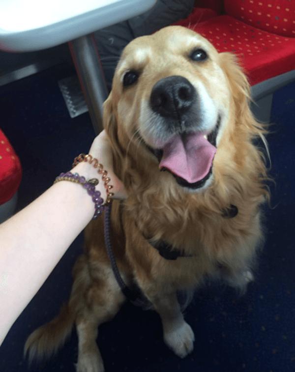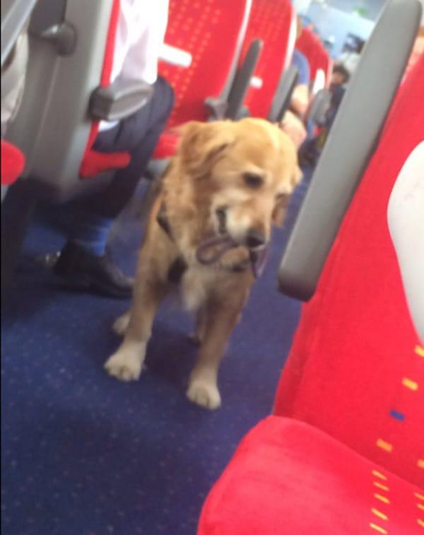 乘客表示,金金會在車廂裡走來走去,就像交際花一樣周旋在不同桌的客人之間(?)。牠還很乖地自己咬著牽繩,會在每個乘客身邊停留好久好久,只為了討摸摸XD