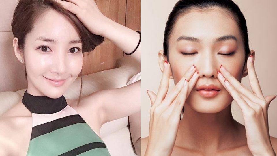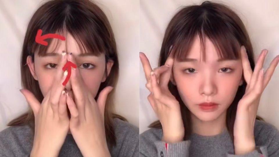將兩個手掌攤開放在顴骨兩邊,再從顴骨滑向鼻樑兩邊來回按摩,每次做30次。
