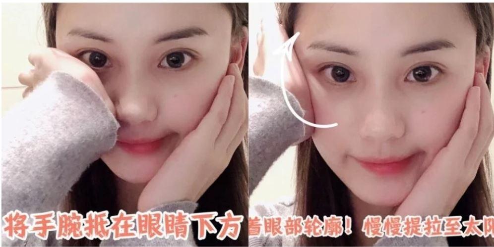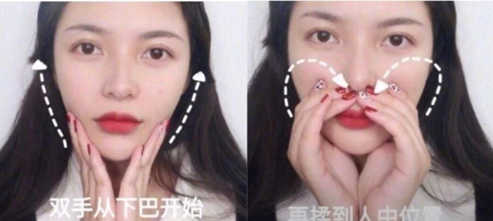 將雙手的手掌由臉頰兩邊顴骨的位置向上提拉至太陽穴,再慢慢順著臉部的輪廓往下滑至下巴!每次做30次。