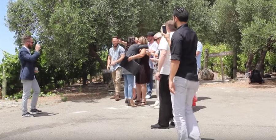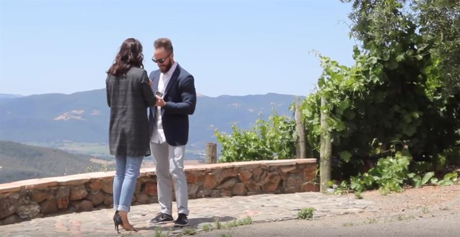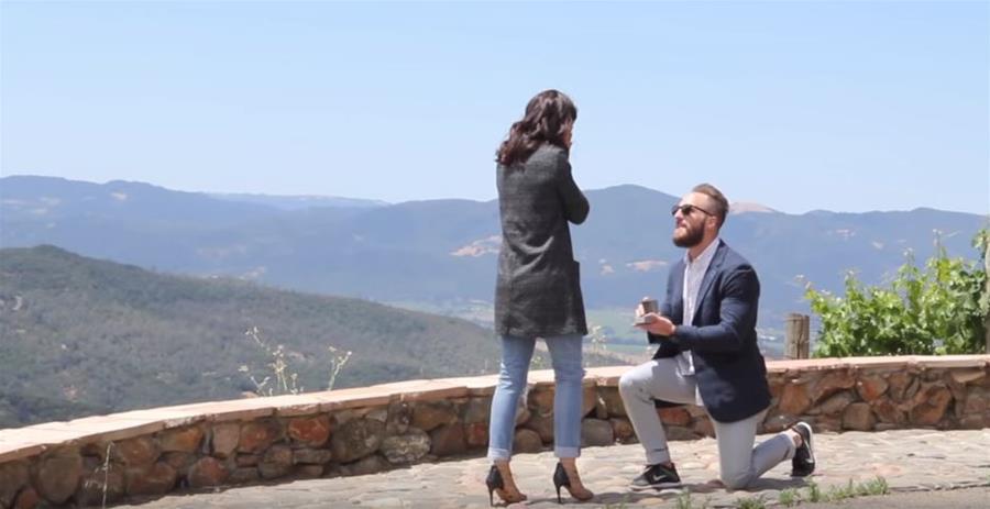 鏡頭前,馬修帶著克莉絲蒂娜來到兩人第一次約會的庫萊托意式酒莊(Kuleto Estate Winery),讓女友看完這段藏著感人驚喜的影片,接著帶對方到酒莊外頭,終於單膝下跪,拿出口袋裡的戒指向對方求婚。
