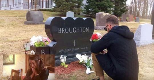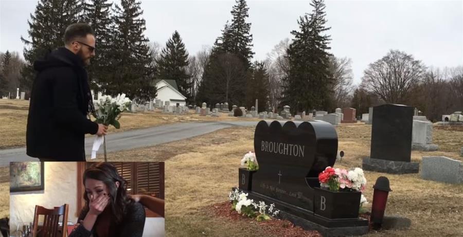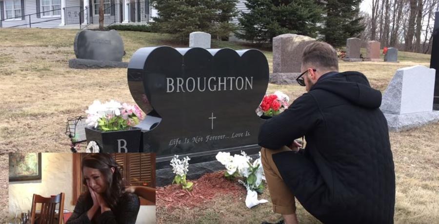 只見影片中,馬修一手拿著攝影機,一手拿著白色花束,單膝跪在一個刻著「布勞頓——人生有盡愛無涯」的墓.碑上, 原來這是克莉絲蒂娜父親的墓.地。